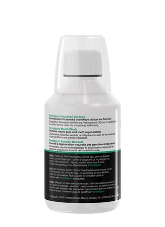 Fluoride mouthwash that prevents and reduces the symptoms of periodontitis Its specialised composition, enriched with Chlorexidine 0.1%, bioactive peptide and Hyaluronic acid, accelerates gum regeneration and prevents the teeth from falling out. It also reduces bone loss, hydrates and heals the gums and prevents the formation of cavities. It has anti-inflammatory and antimicrobial action while treating dental plaque.